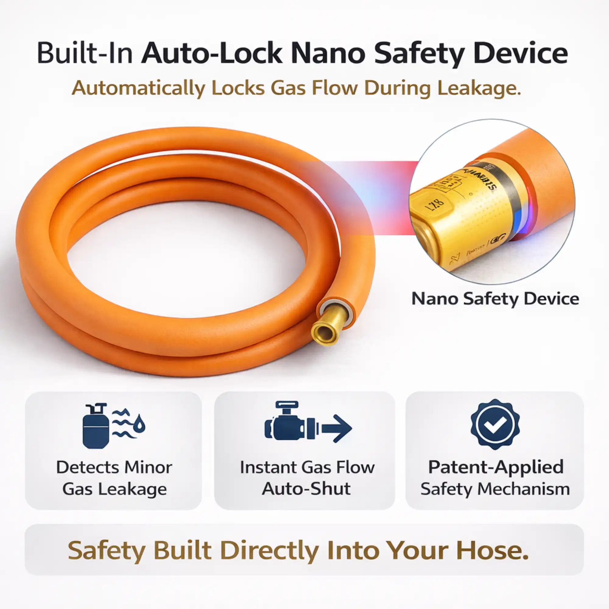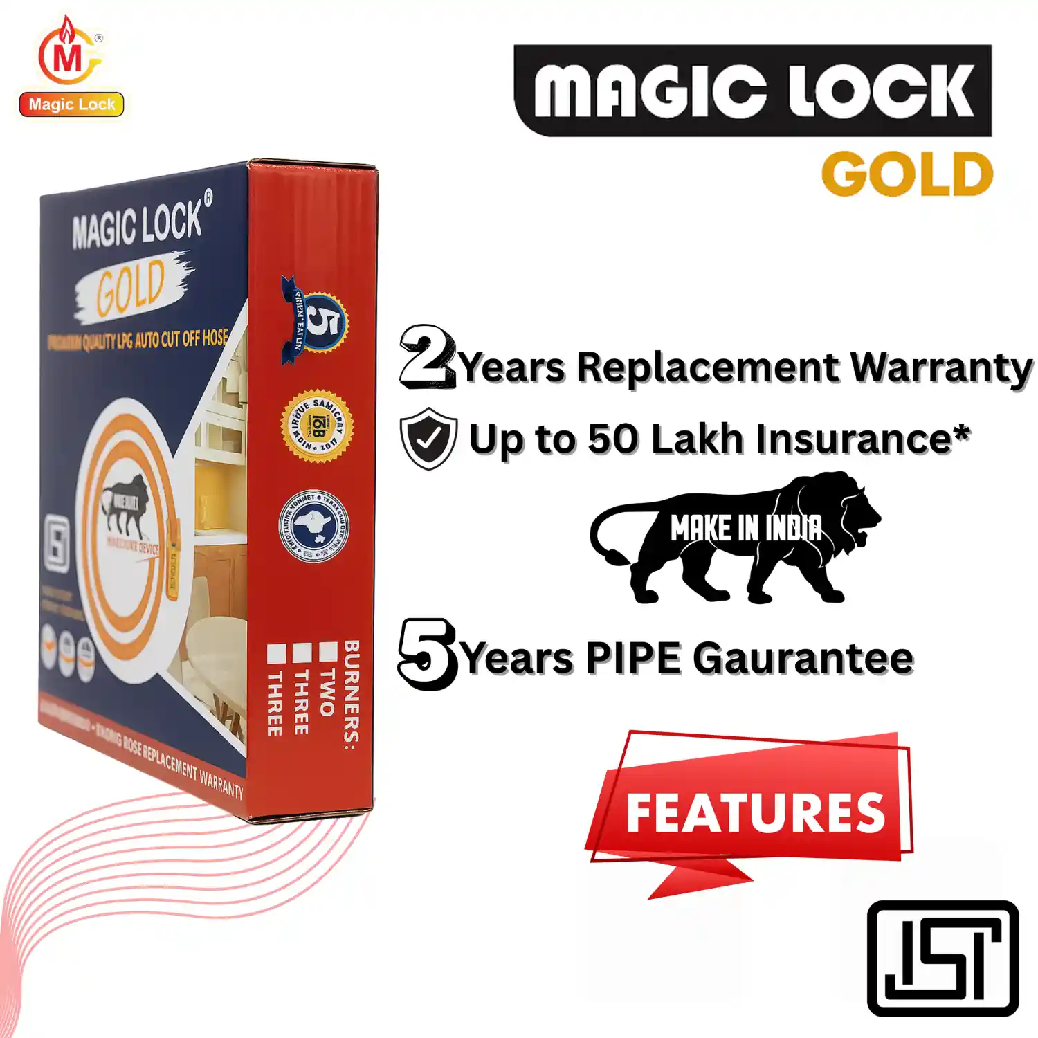 BUY 1, get 1 FREE .. Magic Lock Gold Suraksha LPG Safety Hose 1.5 M, I.S.I – Built-in Auto-Lock Nano Safety Device, ISI & BIS Certified, 5-Year Warranty + 50 LAC Insurance